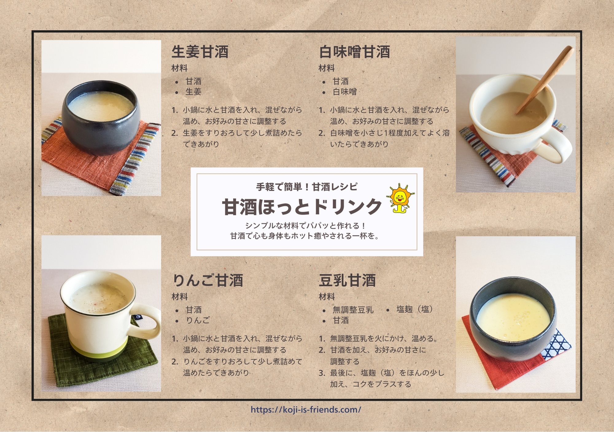 ●甘酒ほっとドリンクレシピ①(生姜甘酒・白味噌甘酒・りんご甘酒・豆乳甘酒)