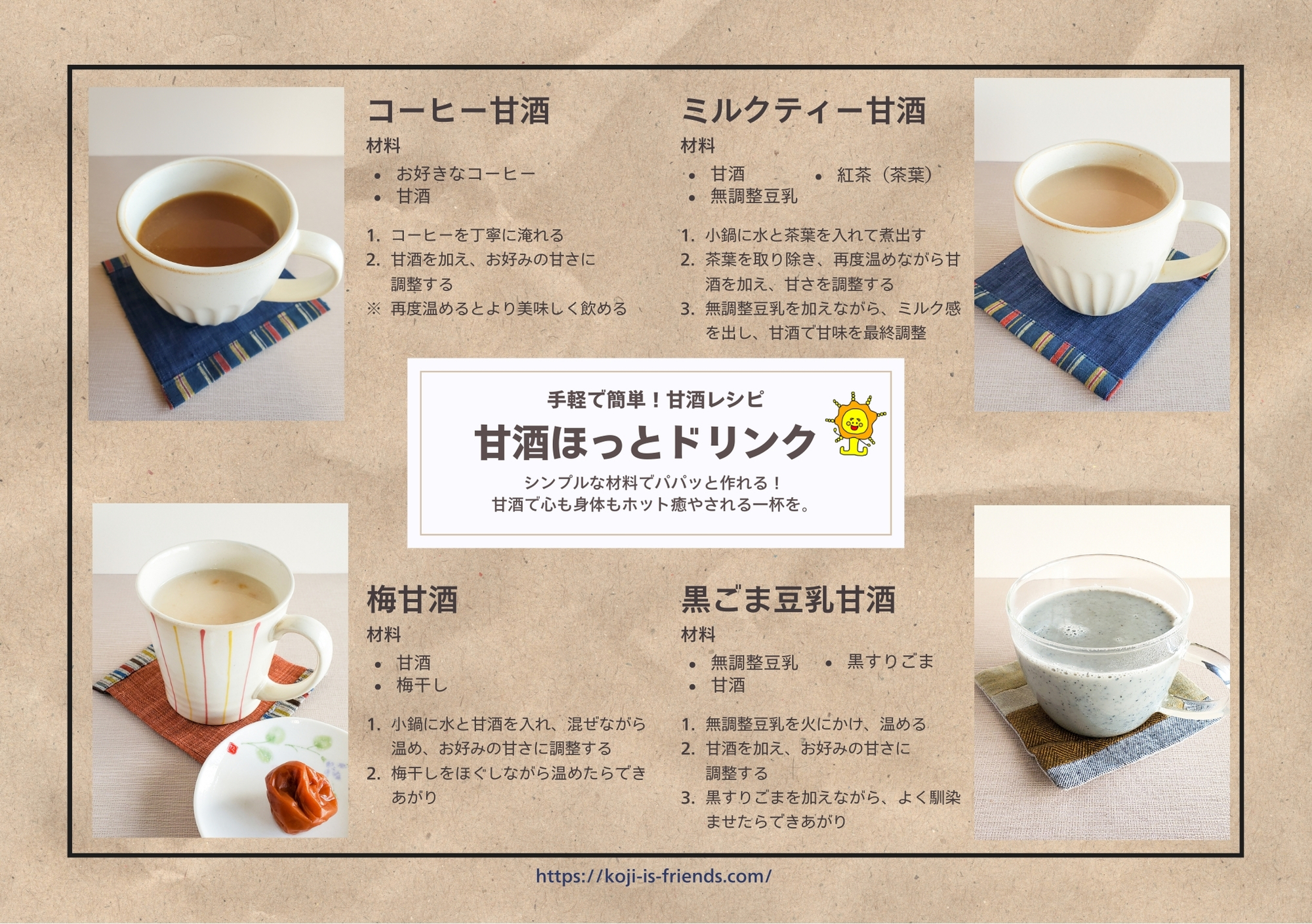 ●甘酒ほっとドリンクレシピ②(コーヒー甘酒・ミルクティー甘酒・梅甘酒・黒ごま豆乳甘酒)
